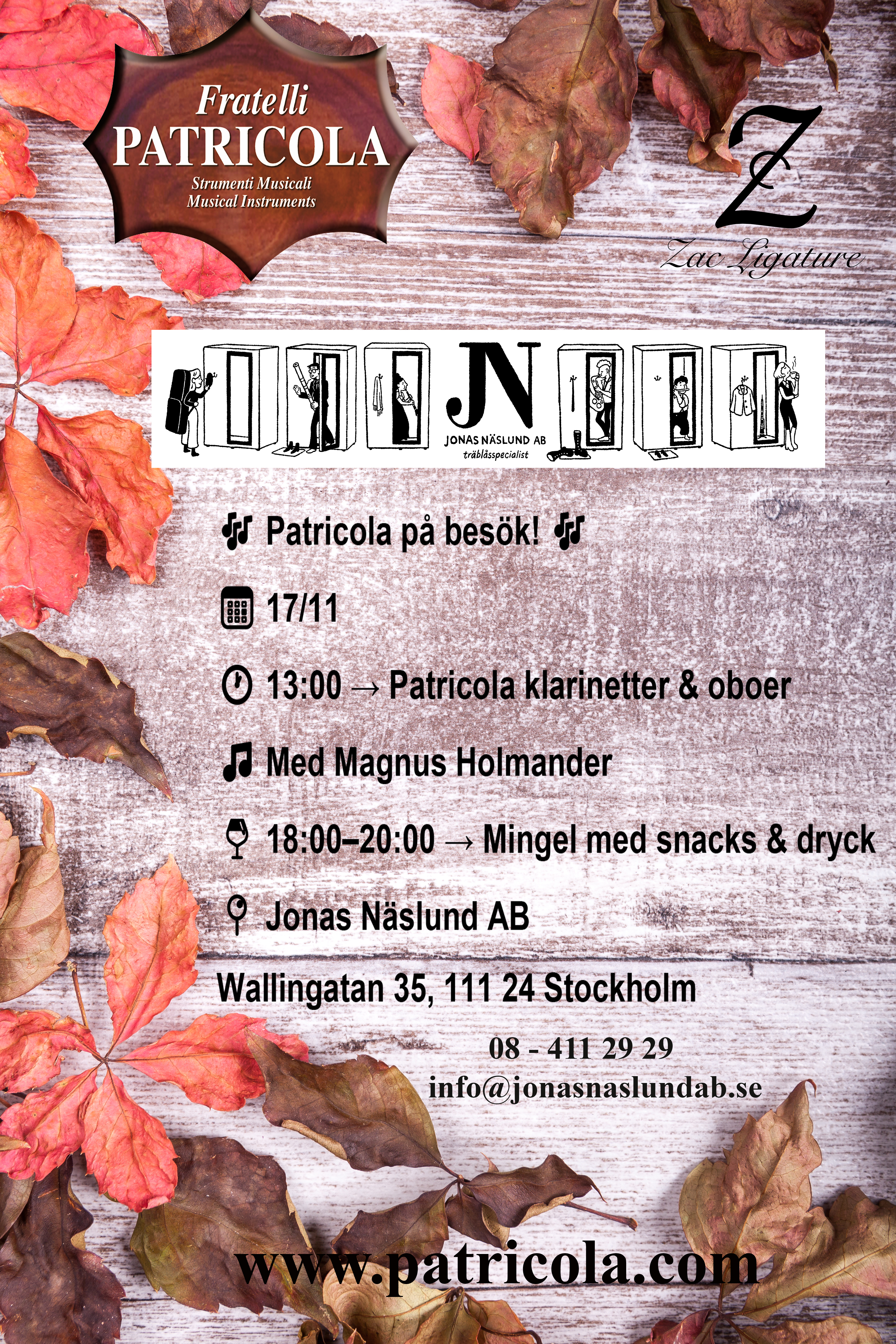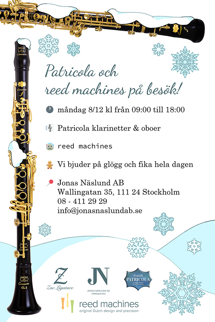 Tags Jonas Näslund Jonas Näslund – Patricola Angelo October 18, 2025 Jonas Näslund – Patricola Patricola på besök!17/11/202513:00 → Patricola klarinetter & oboerMed Magnus Holmander18:00–20:00 → Mingel med snacks & dryckJonas